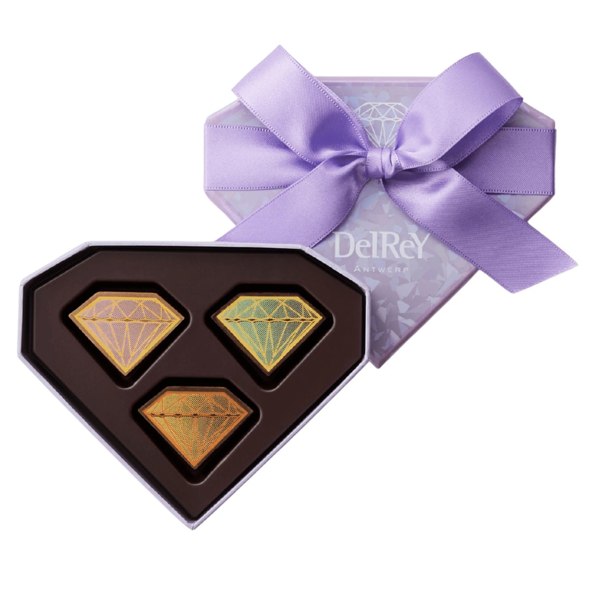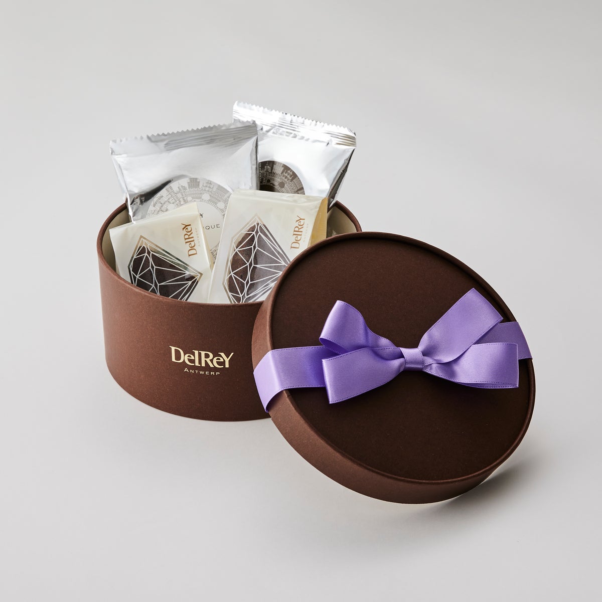 高貴さを象徴するパープルカラーのリボンをあしらい、デルレイならではのチョコレート菓子を、優雅なフォルムのボックスに収めています。