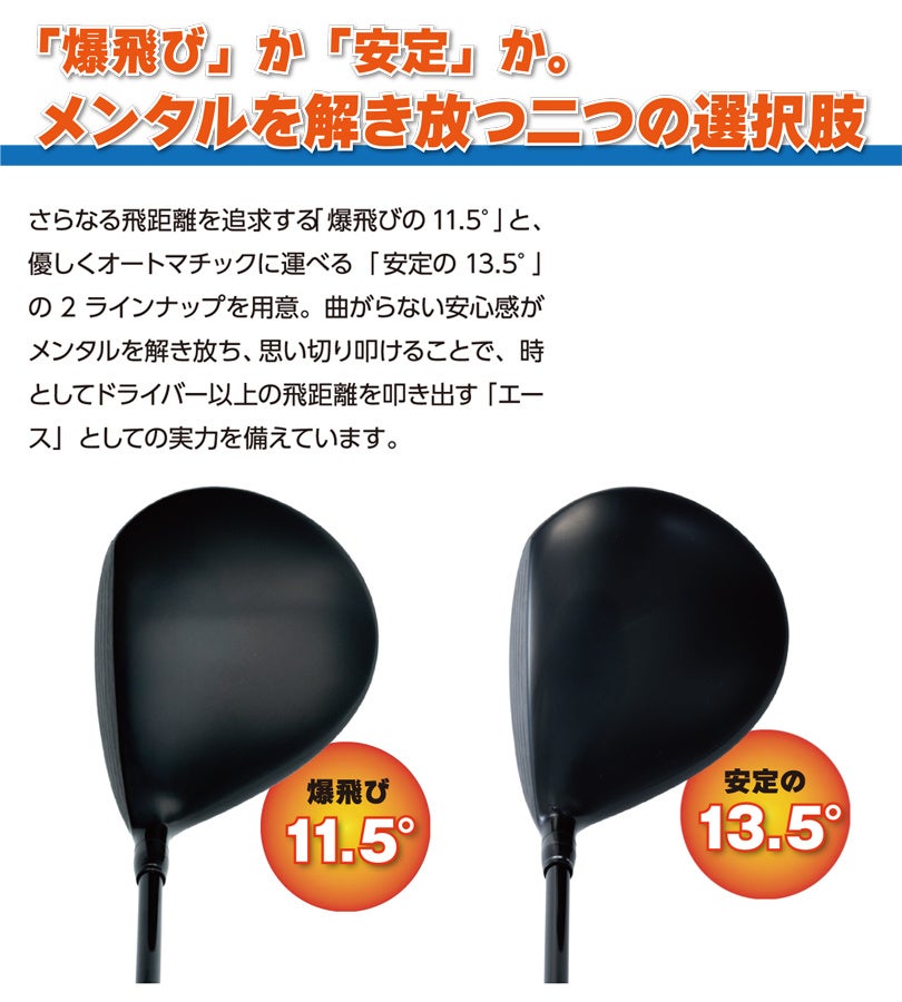 さらなる飛距離を追求する「爆飛びの11.5°」と、優しくオートマチックに運べる 「安定の 13.5°」の2ラインナップを用意。
