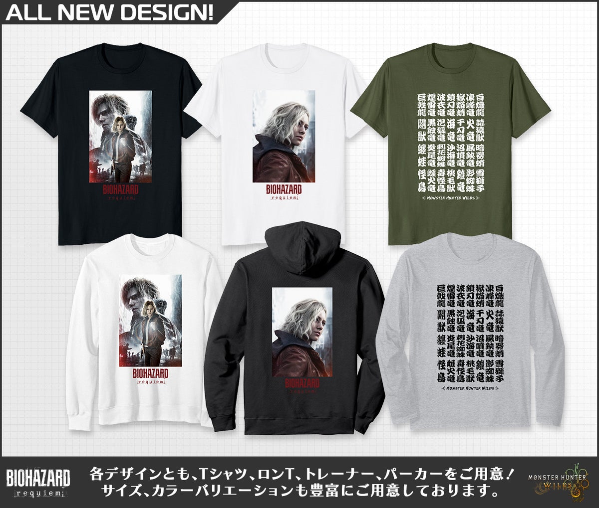 ついに発売となったシリーズ最新作『バイオハザード レクイエム』から2種類のアートを使用した新デザインと、発売から1年を迎える『モンスターハンターワイルズ』からモンスターの漢字名称がデザインされた新デザインが登場!  半袖Tシャツはもちろん、ロンT、トレーナー、パーカーのお好きなタイプからお選びいただける他、前面プリントと背面プリントをお選びいただけます。今すぐチェック!