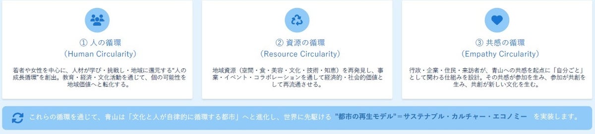 ⻘山の強みである「上質」「創造」「文化発信力」を活かし、以下の3つの循環を街全体に実装します。
