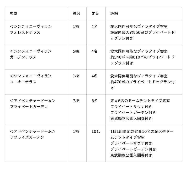 「グランフィルリゾーツ東武」では、ドーム型客室やプライベートドッグラン付きヴィラなど、旅の目的や過ごし方に合わせて選べる全5タイプの客室をご用意しています。ファミリー旅行、カップルでの滞在、愛犬との特別な時間など、お客様それぞれのスタイルに寄り添う多彩な客室が、快適で思い出深いひとときを演出します。