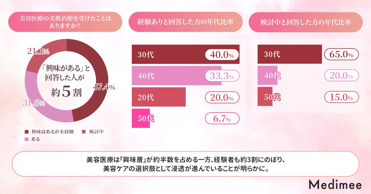 今回の結果からは、美容医療は“特別な施術”というよりも、具体的な肌悩みを感じたタイミングで取り入れる現実的な選択肢として定着しつつあることが示唆されました。