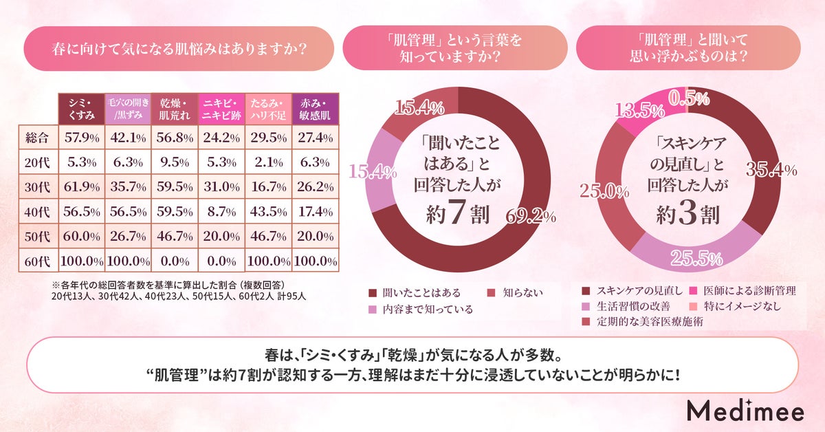 今回、Medimeeでは20代~60代の女性を対象に、春前に気になる肌悩みや「肌管理」の認知度、美容医療の受診経験や検討理由について調査を実施しました。
