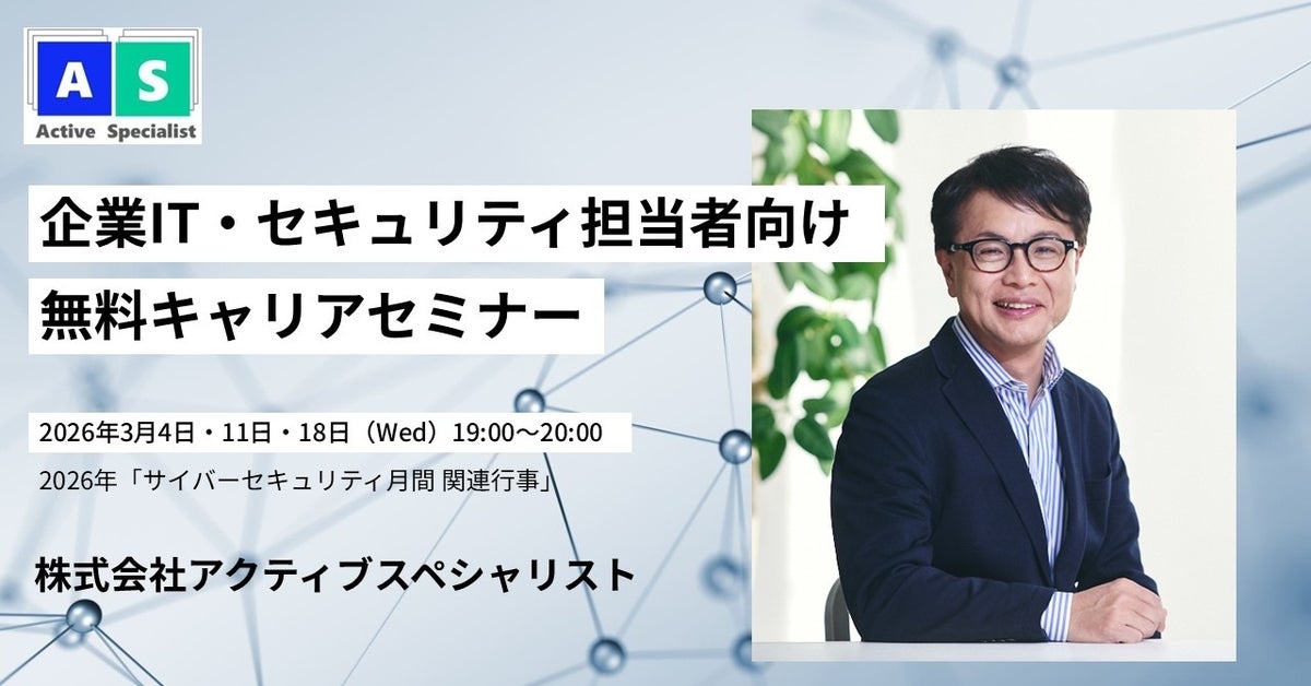 株式会社アクティブスペシャリスト(本社:東京都世田谷区 代表:松澤寿典)は、2026年3月4日(水)・11日(水)・18日(水)に、企業IT・セキュリティ担当者向けたキャリアセミナーを無料開催いたします。本セミナーは、深刻なサイバーセキュリティ人材不足を受けて実施されます。