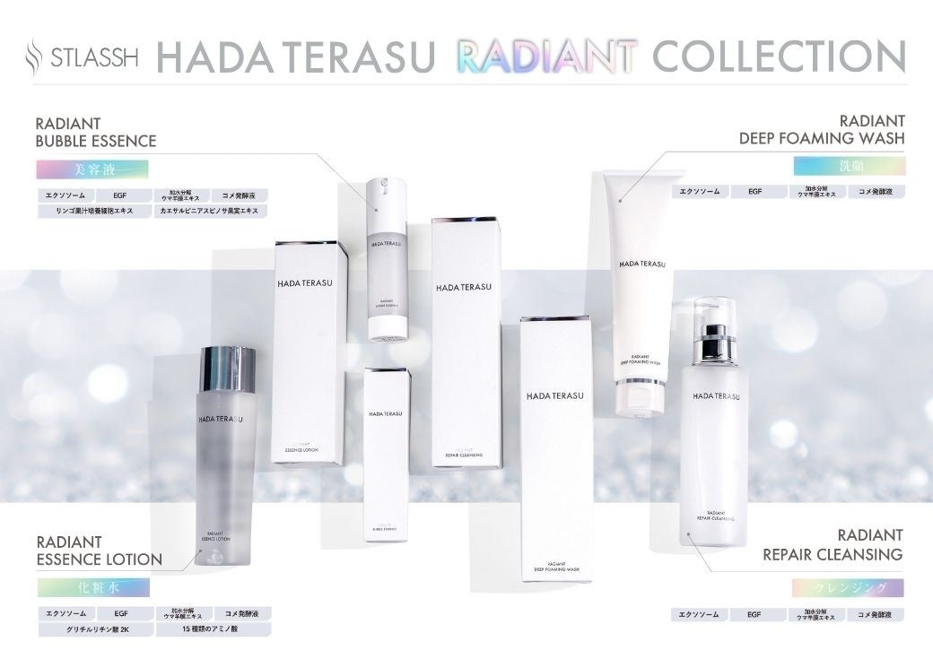 HADA TERASUから、新たに「RADIANT」シリーズが誕生しました。 「RADIANT」には「光を放つ」「光り輝く」という意味が込められています。このシリーズは、HADA TERASUをお使いいただくお客様が、より一層「光り輝く透輝肌」を叶えていただけるように願いを込めて開発されました。
