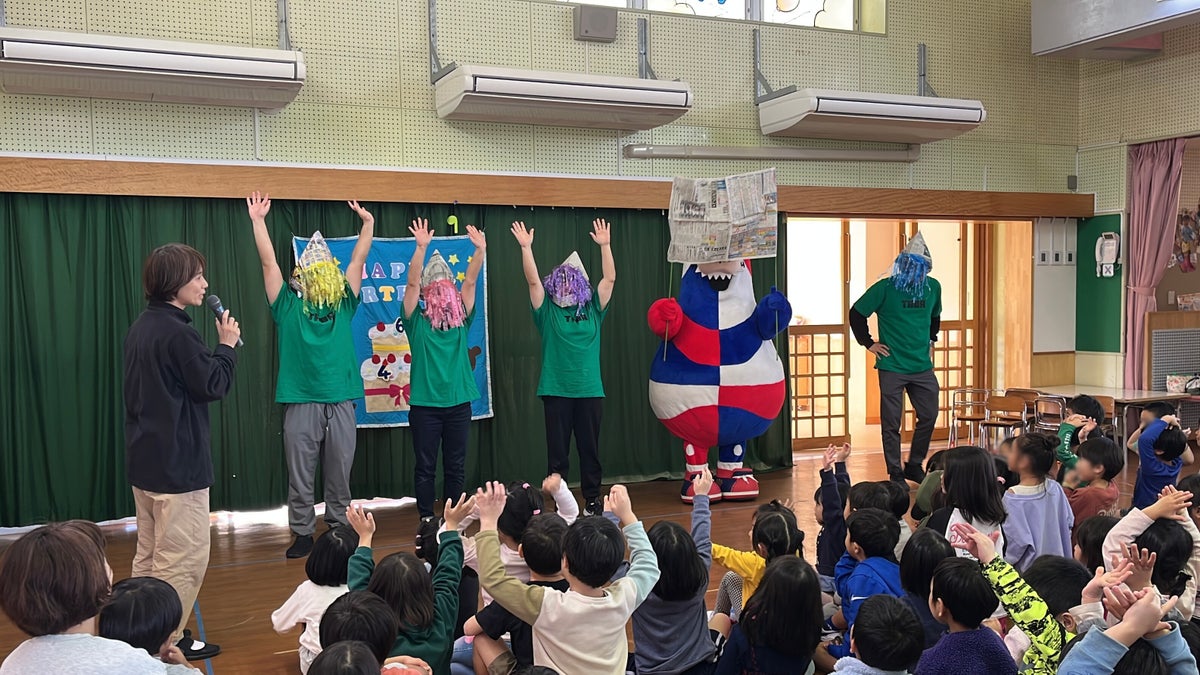 お誕生日会では「この先生は誰だクイズ」や「ゴーディークイズ」を行いました。ゴーディーが顔を隠して登場すると、すぐに「ゴーディーだ!」と気づく子どもたちの元気な声が響き渡り、大盛り上がりのひとときとなりました。