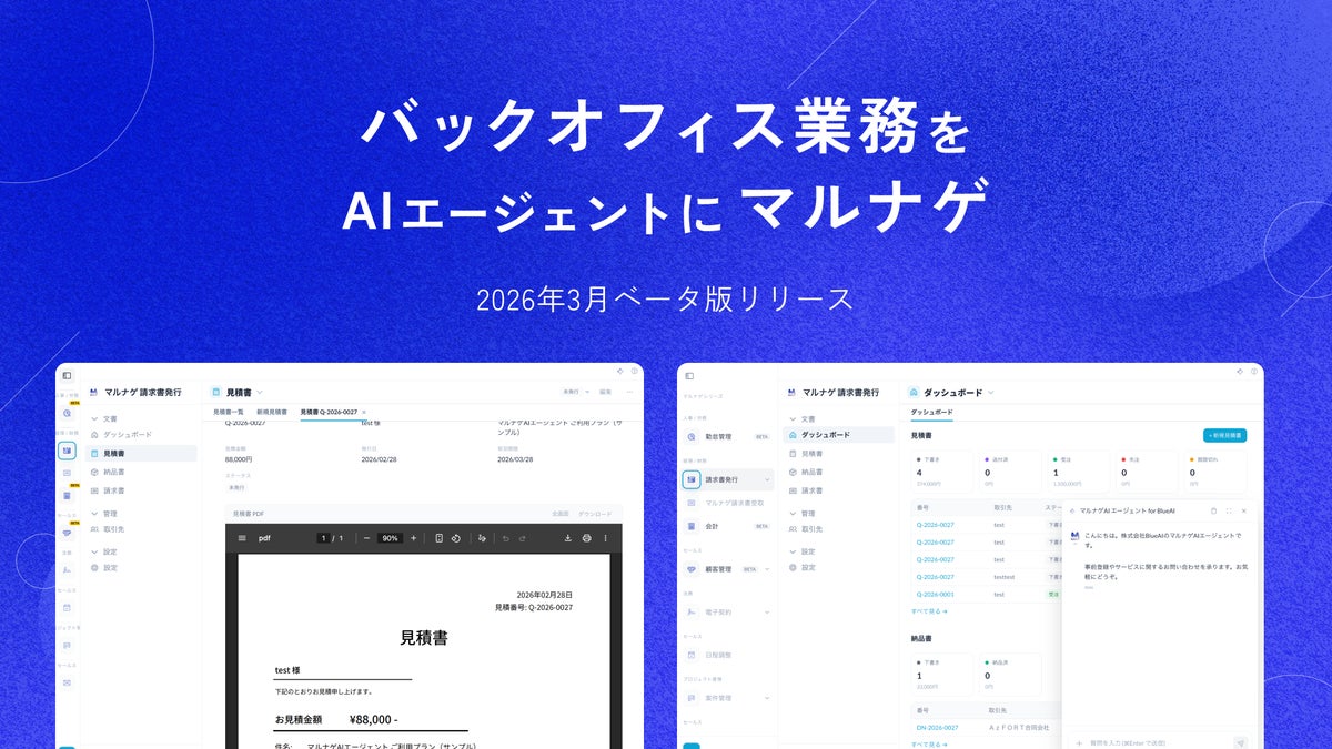 株式会社BlueAI(本社:東京都渋谷区、以下BlueAI)は、バックオフィス業務を一気通貫で管理する統合業務プラットフォーム 「マルナゲ」 の事前登録を2026年3月1日 より公開いたします。