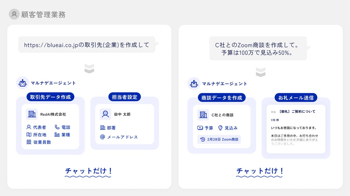 顧客管理業務も「商談作成とお礼メール送信して」とチャットするだけ