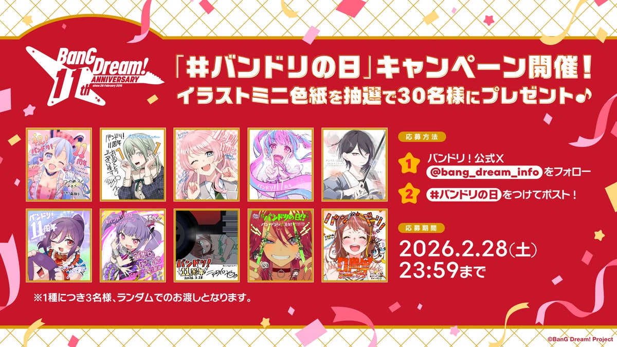 バンドリ!公式Xをフォローし、「#バンドリの日」でポストいただいた方の中から、抽選で「お祝いイラストミニ色紙」をランダムで30名様にプレゼントいたします。