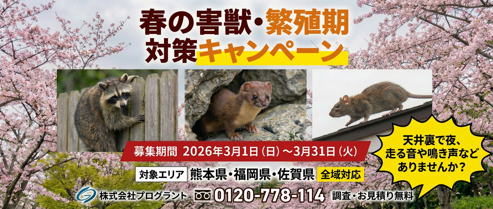 熊本県・福岡県・佐賀県でアライグマ駆除・イタチ駆除・ネズミ駆除を手がける害獣駆除専門企業の株式会社プログラント(本社:熊本市北区、代表取締役:藤井 靖光)は、2026年3月1日より、「春の害獣・繁殖期対策キャンペーン」を熊本県・福岡県・佐賀県の全域で開始します。是非この機会に害獣被害が拡大する前の対策を行いましょう。