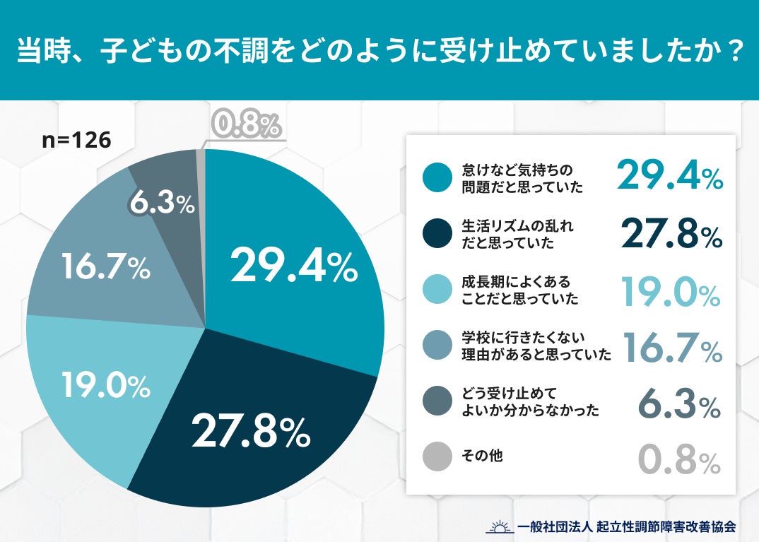起立性調節障害は、自律神経の乱れにより、起床時の立ちくらみや強い倦怠感、頭痛などが現れる身体疾患です。しかし、午後から夕方にかけて回復する傾向があるため、「夜更かしのせい」「甘え」といった精神論で片付けられやすく、適切な支援が遅れる一因となっています。 「なぜもっと早く気づけなかったのか」という保護者の苦悩を可視化し、家庭や学校において“不調の裏に隠れた病”への理解を深めていただくため、本調査を実施いたしました。調査サマリー