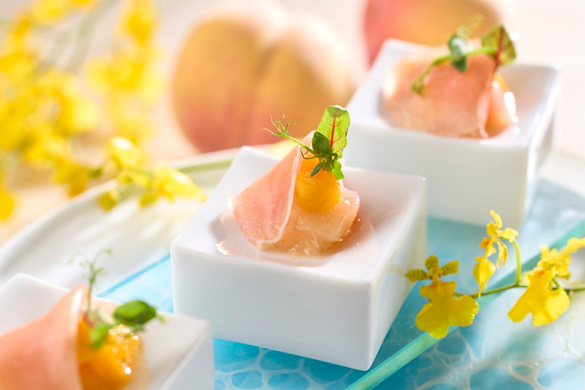 夕食前後の17時~22時では「ナイトアフタヌーンティー」をテーマに、お酒とのマリアージュをお楽しみいただけるメニューをご提供いたします。焼き菓子や生ハムと桃の取り合わせ、フルーツなどワインや日本酒とも合う品々となっております。