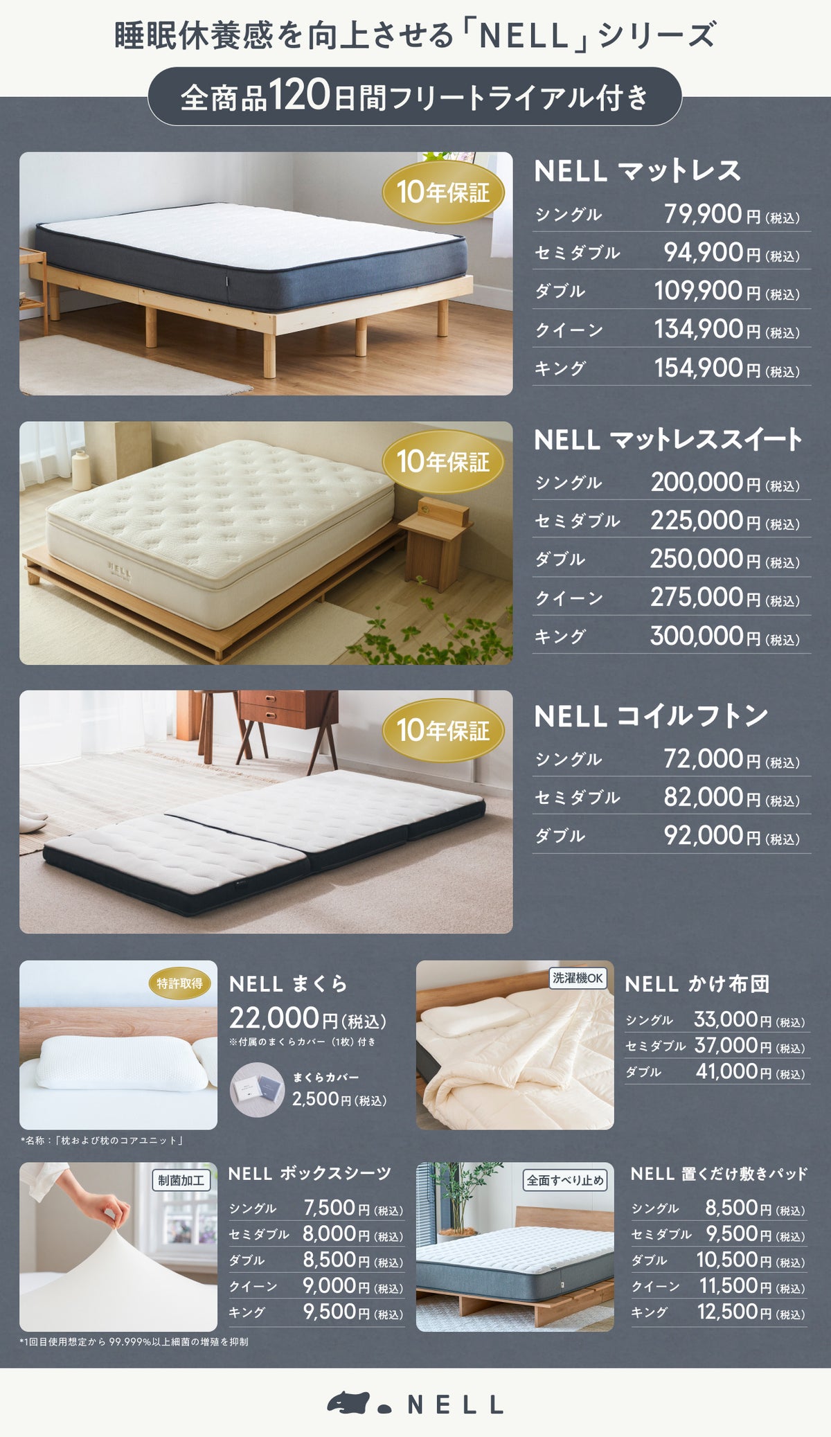 そんな体験をより多くの方に届けるため、主力製品の「NELL マットレス」に加え、2月に登場した「NELL コイルフトン」も対象とした、1年で最も盛り上がるセールを実施いたします。