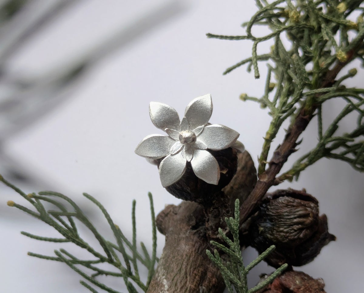 京都で学んだ鍛金・彫金などの金属工芸の伝統技法をベースに、銀・銅合金・錫などを用いて植物モチーフのアイテムを制作しています。バラや桜などのアクセサリーを中心に、オブジェやテーブルウェアなども御用意しています。