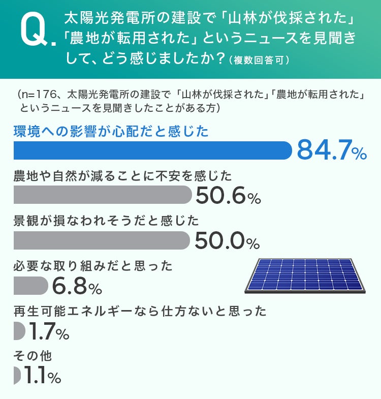 今回の調査では、太陽光発電所の建設にともなう山林伐採や農地転用のニュースを見聞きした方のうち、84.7%が「環境への影響が心配」と感じていることがわかりました。