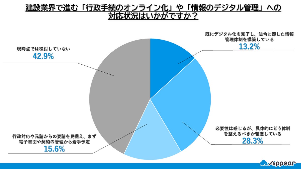 行政手続のオンライン化や情報のデジタル管理への対応状況について、「既にデジタル化を完了し、法令に即した情報管理体制を構築している」と回答した企業は13.2%にとどまりました。