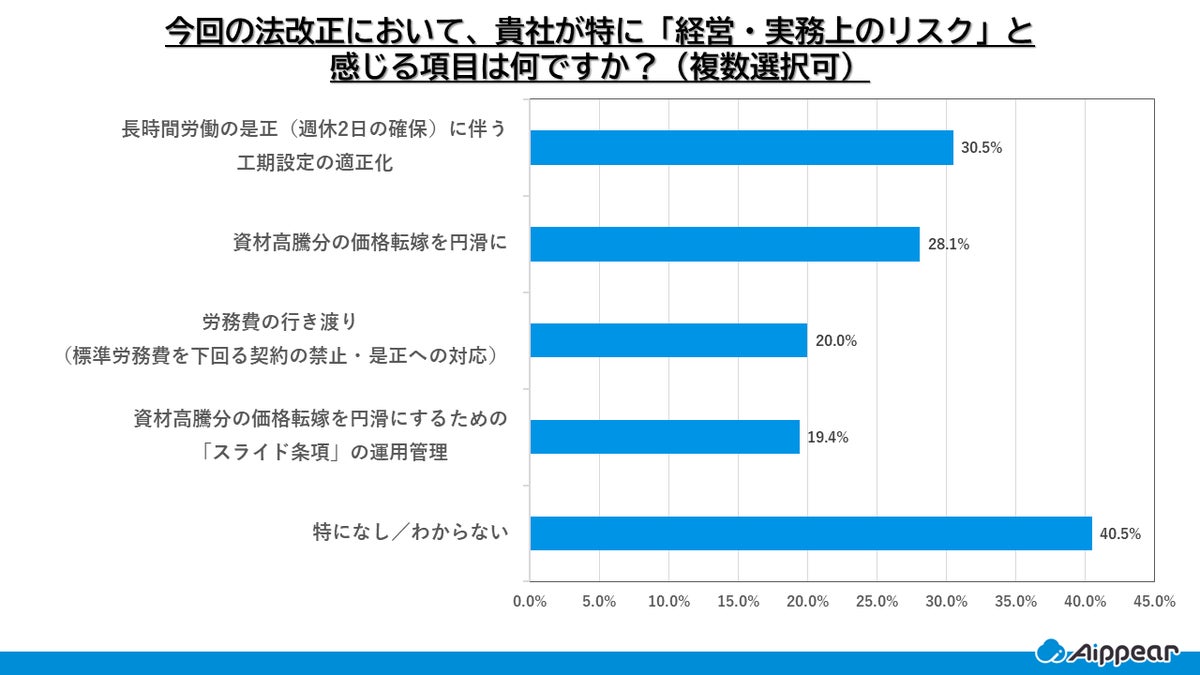 今回の法改正において、経営・実務上のリスクとして最も多く挙げられたのは、「長時間労働の是正(週休2日の確保)に伴う工期設定の適正化」(30.5%)でした。