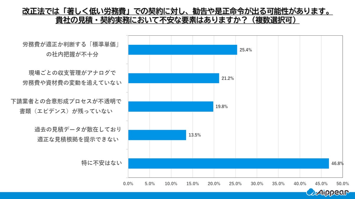 これを受け、見積・契約実務における不安要素としては、「労務費が適正か判断する標準単価の社内把握が不十分」(25.4%)、「現場ごとの収支管理がアナログで、労務費や資材費の変動を追えていない」(21.2%)、「下請業者との合意形成プロセスの証跡が残っていない」(19.8%)など、複数の課題が挙げられました。