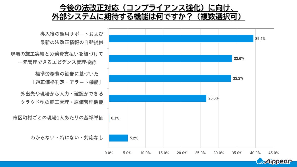 今後の法改正対応(コンプライアンス強化)に向けて、外部システムに期待する機能としては、「導入後の運用サポートおよび、最新の法改正情報の自動提供」(39.4%)が最も多く挙げられました。次いで、「現場の施工実績と労務費支払いを紐づけて一元管理できるエビデンス管理機能」(33.6%)、「標準労務費に基づいた適正価格判定・アラート機能」(33.3%)が続いています。