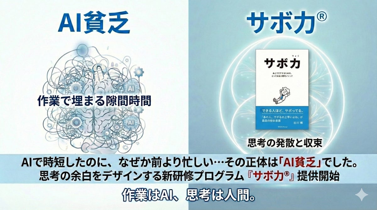 「サボり」を戦略的なビジネススキルとして再定義する株式会社BitBiz(本社:東京都渋谷区、代表:谷川輝)は、AI導入によって生まれた時間をさらなる「作業」で埋めず、成果に直結する「思考の余白」へと転換する法人向け研修プログラム『サボ力(R):AI時代の戦略的余白デザイン』の提供を開始いたします。