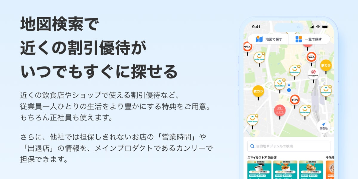 「カンリー福利厚生」は、スマートフォンアプリを通じて、従業員が現在位置から利用可能な割引優待を即座に検索し、何度でも利用できる次世代型の福利厚生サービスです。