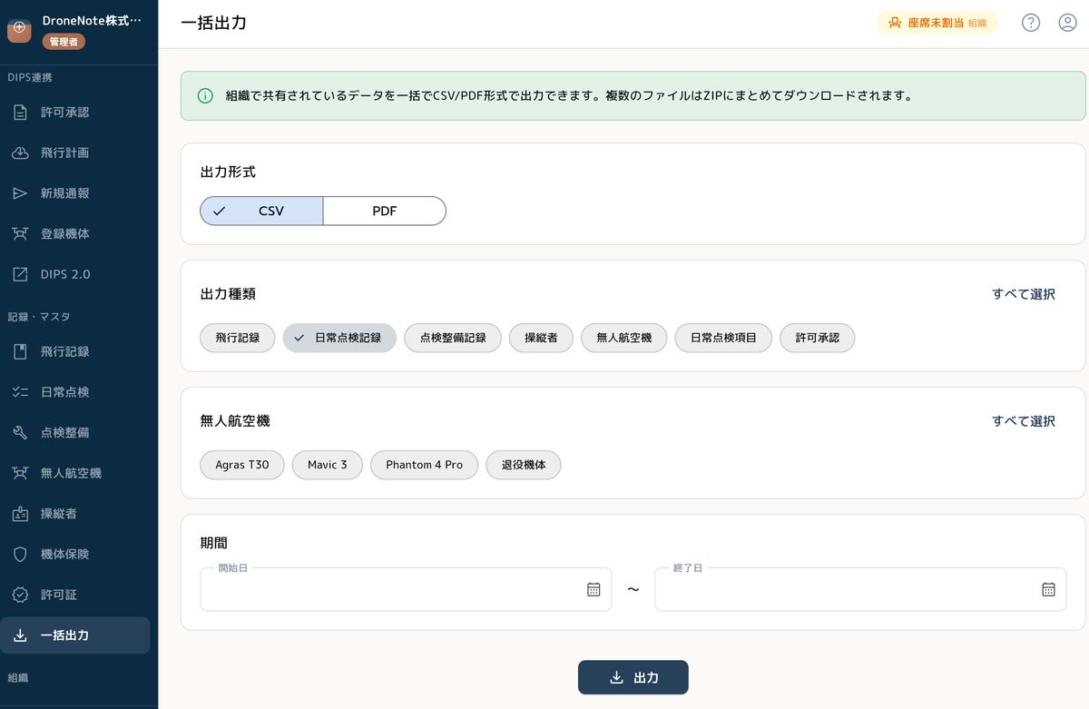 飛行記録、日常点検記録、点検整備記録、機体情報、操縦者情報など、各種データのCSV出力およびPDF出力に対応しています。監査や報告書作成の効率化に貢献します。