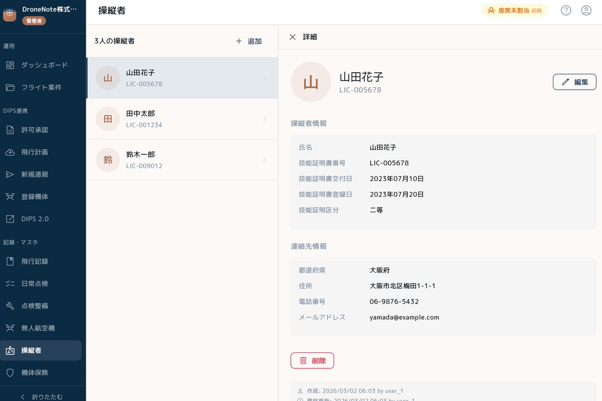 機体(無人航空機)と操縦者の情報をWeb管理ポータル上で登録・編集し、組織メンバー間で共有できます。モバイルアプリとのデータ連携により、現場での入力負荷を軽減します。