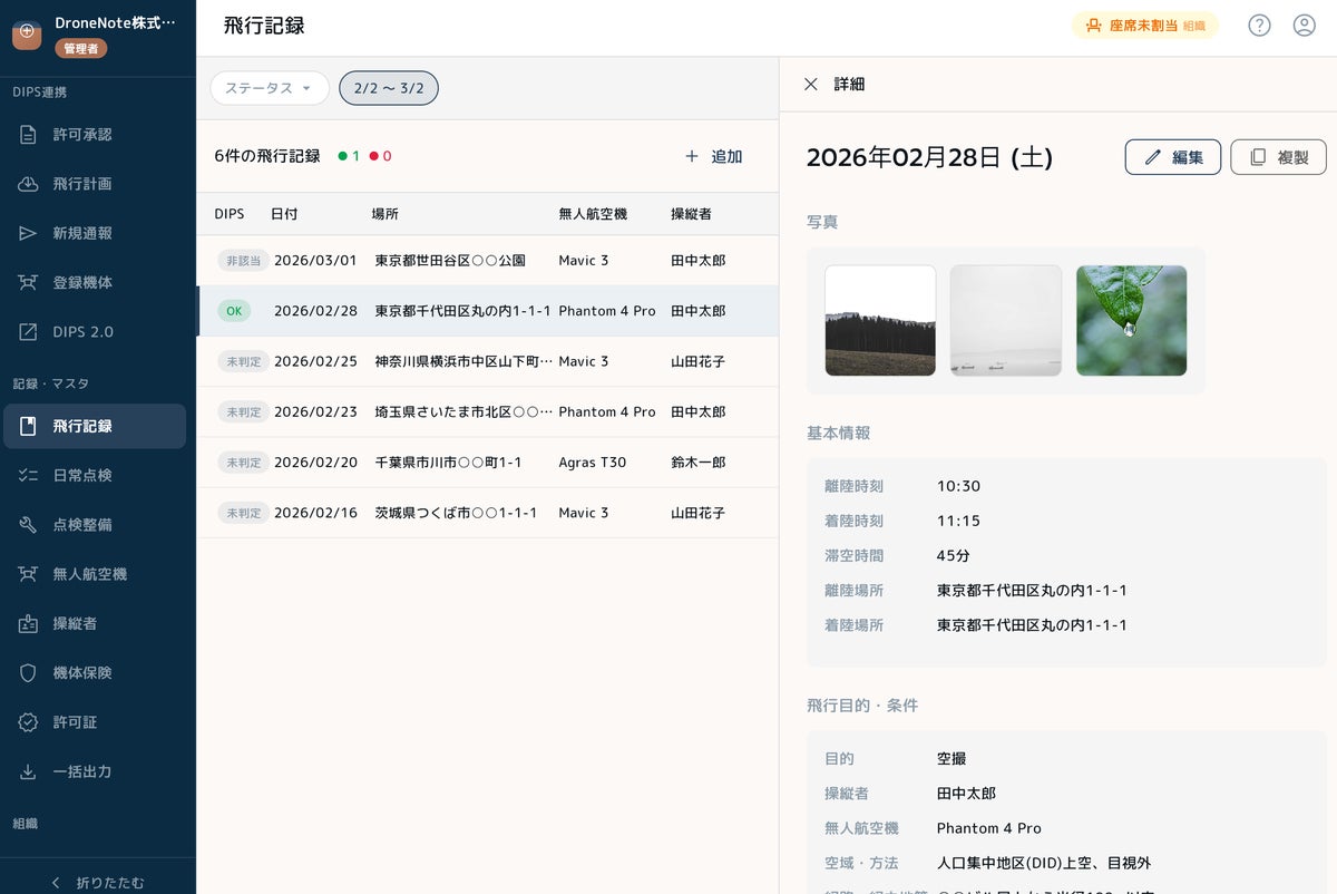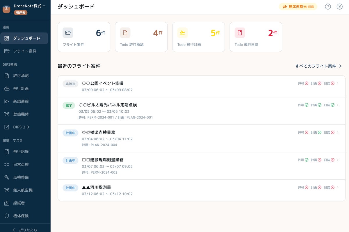 - DIPSでの飛行許可申請・飛行計画通報と、日常の飛行日誌管理が分断されており、作業の手間や申請・作成漏れが生じやすい