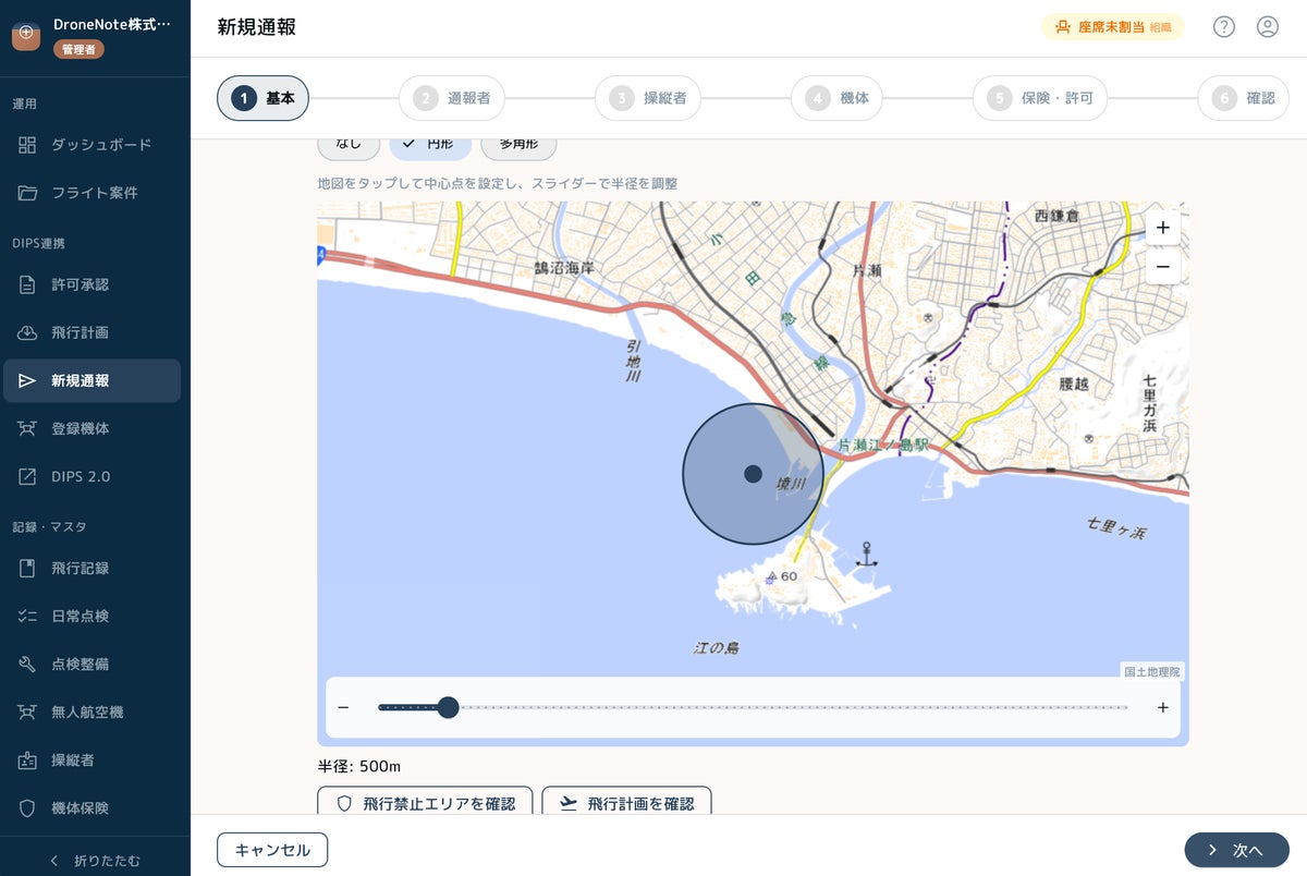 国土交通省のドローン情報基盤システム(DIPS 2.0)と連携し、飛行許可承認・飛行計画・機体登録情報をポータル上で確認・管理できます。飛行計画の通報にも対応しており、DIPSに登録済みの情報と飛行日誌の紐付けにより、法令遵守状況を一目で把握できます。