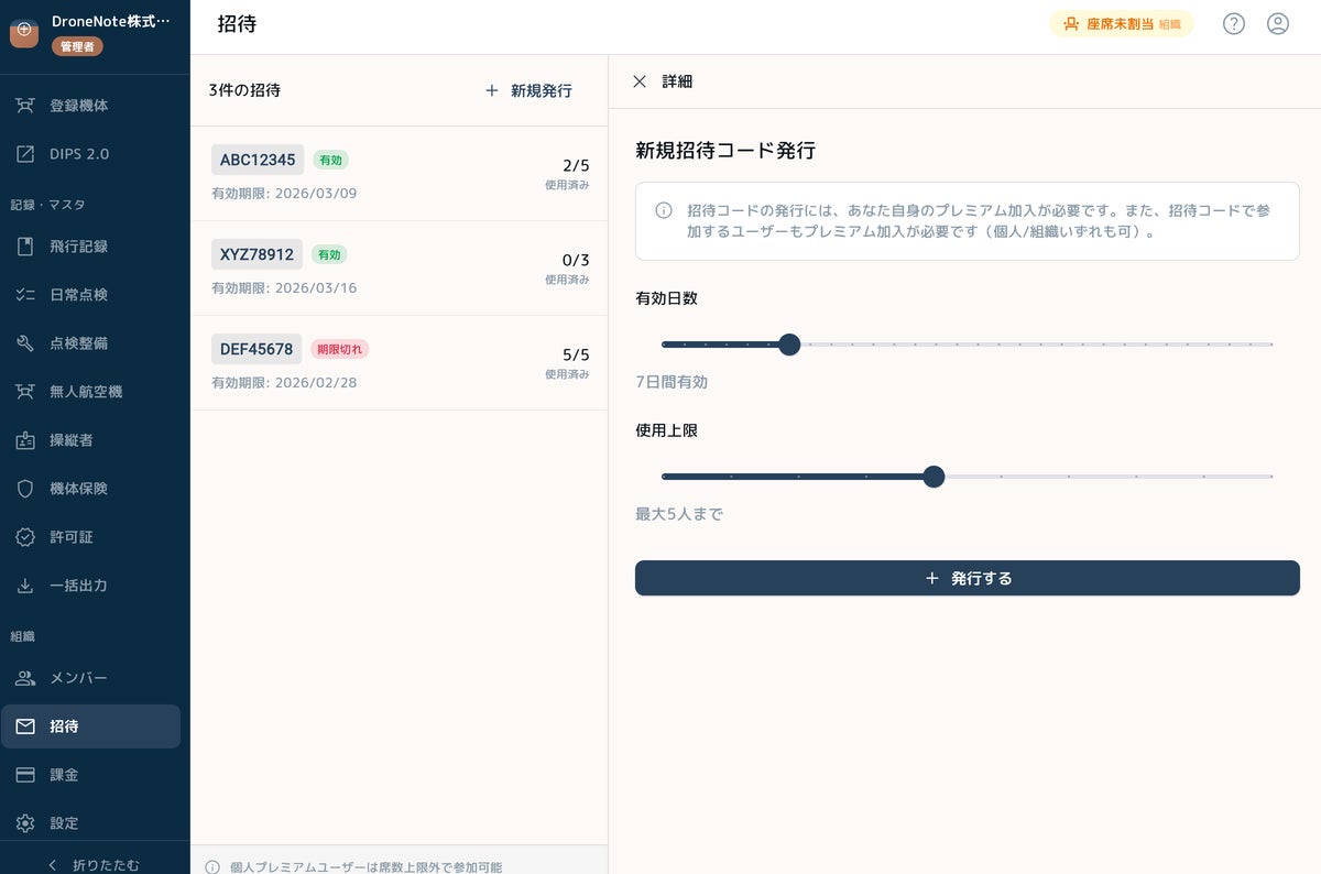 組織を作成し、招待コードを用いてメンバーを追加できます。管理者・メンバーのロール設定により、適切な権限管理が可能です。