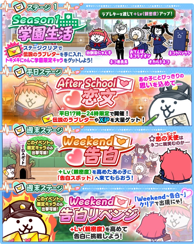 「伝説のラブレター」を集めて限定EXキャラ「幼馴染にゃん子」「おてんばネコライオン」「ネコクバンケシ」「ネコ委員長」に加え、新たに参戦した「オカルトネコ」などをゲットしましょう。