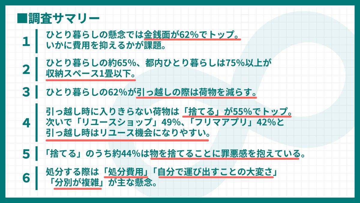 ■ひとり暮らしの懸念No.1は金銭面。62%が荷物を減らして引っ越し費用削減と1畳以下の収納スペースに対応
