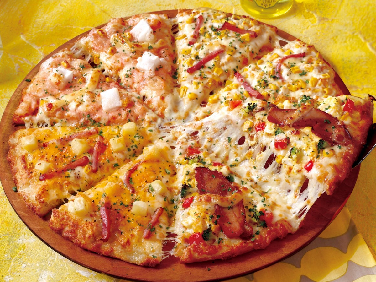 「たっぷりクリーミーコーンピザ」…甘みあふれるコーンをたっぷりとトッピングし、厚切りベーコンの旨みと濃厚な特製グラタンソースがとろけ合う人気ピザ。