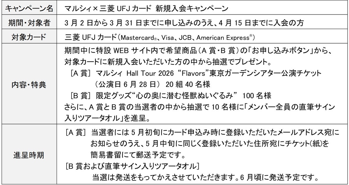 具体的には、「マルシィ×三菱UFJカード 新規入会キャンペーン」の特設WEBサイトから新規入会すると、A賞「マルシィ Hall Tour 2026 “Flavors”東京ガーデンシアター公演チケット」が抽選で20組40名様、B賞「限定グッズ“心の奥に潜む怪獣ぬいぐるみ”」が100名様に当たるもの。さらに、A・B賞の当選者の中から抽選でメンバー全員の直筆サイン入りツアータオル」を10名様に進呈します。