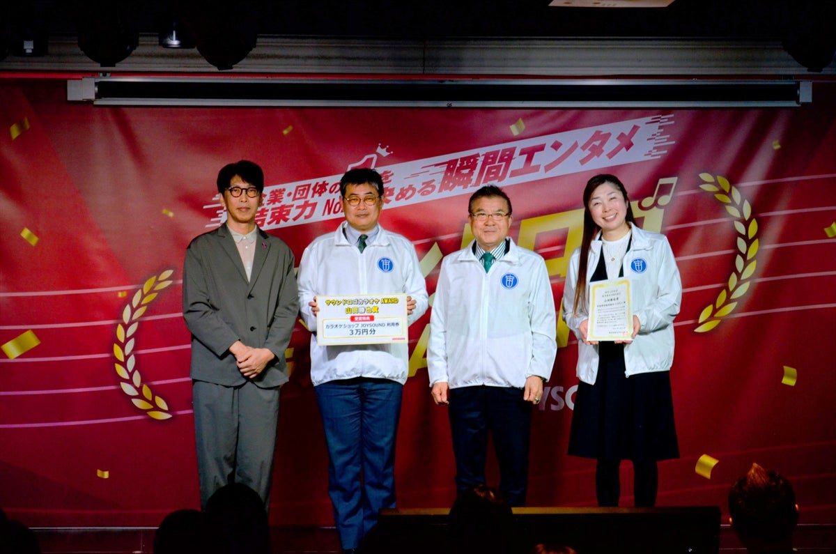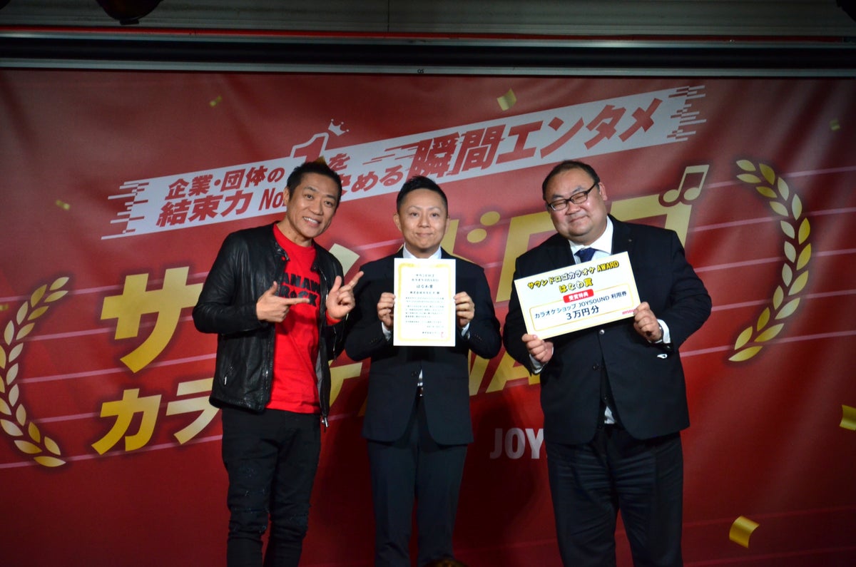 表彰式では、代表者が「初代サウンドロゴカラオケAWARDを突破(TOPPA!!!)できるとは思っていなかったので、驚いています!」と喜びのコメント。祝福ムードに包まれる中、表彰状とトロフィーが授与されました。副賞として、TOPPANホールディングスには、CM音楽やテレビ・ラジオ・ 映画など、幅広いメディア向けの音楽制作を手がける株式会社愛印による、サウンドロゴの楽曲化(サウンドロゴを含む楽曲を制作)、およびそのカラオケ配信権が贈られました。