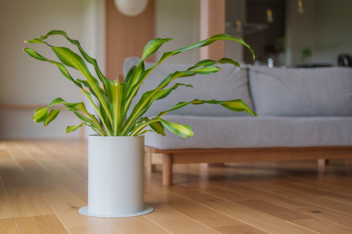 背の高い観葉植物は空間に豊かな表情を与える一方で、転倒リスクや日常の扱いに不安を感じる場面もあります。PLUSTは、水門メーカーとして培った金属加工技術を活かし、植物を安定して支えることを目的に開発されたプランターカバーです。
