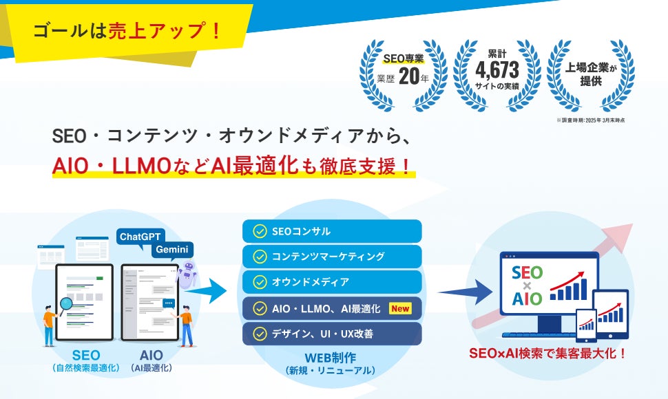 2005年の創業以来、20年以上にわたりGoogleのガイドラインに従った「ホワイトハットSEO」で培ったWebマーケティングの知見と実績を基盤に、累計4,673以上のWebサイトの検索エンジン最適化を行ってきました。そして、AI時代の情報探索の変化に対応すべく、AI最適化(AIO/LLMO)サービスを新たに展開。AIがコンテンツを深く理解し、生成AI搭載検索エンジンでも適切に評価・表示されるよう支援します。
