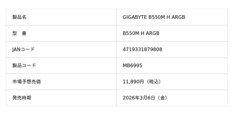 株式会社ニューエックス(本社:東京都千代田区)は、取り扱いメーカーであるGIGABYTEより、AMD B550 チップセットを搭載した上 Micro-ATX マザーボードの「GIGABYTE B550M H ARGB」を2026年3月6日(金)に発売いたします。