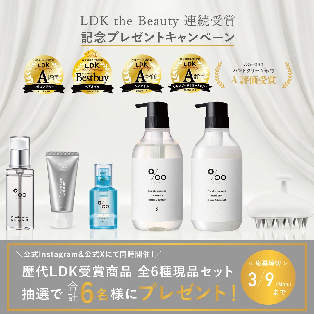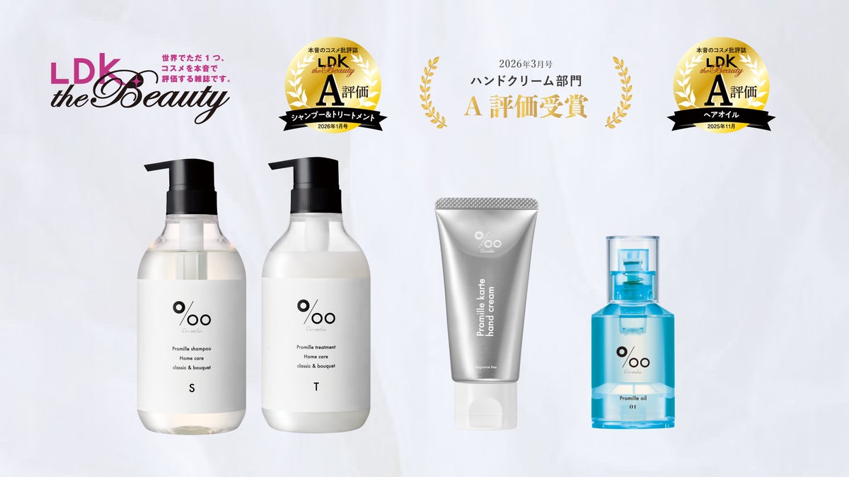 天然由来成分にこだわり、ユーザーのライフスタイルに寄り添うアイテムを幅広く展開するヘアケア&スタイリングブランド「Promille(プロミル)」が、本音でコスメを評価する雑誌『LDK the Beauty』において、下半期*1にA評価を3連続で受賞。製品の品質や仕上がりの良さが高く評価されました。