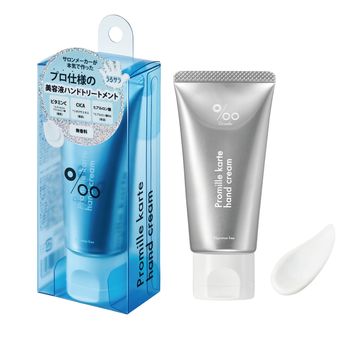 本商品はプロミルブランドこだわりの12種の天然由来成分*5と16種の美容成分*6を配合し、保湿とケアに特化したハンドクリームです。サラッと馴染んで密着し、潤いを閉じ込める”モイストヴェール効果”で、手荒れを防ぎ、指先まで透明感に満ちたなめらかな手肌に導きます。