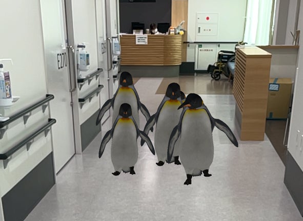 横須賀市立総合医療センターでは、2階小児科外来に旭山動物園でも人気の『ペンギンのさんぽ』を院内に再現。外来待合の空間をペンギンたちが歩き回ります。4階病棟のプレイルームにはライオンが現れ、入院中の子どもたちが日常的に体験できる環境を整えました。今後は空中を泳ぐペンギンやアザラシなど、新たなコンテンツを順次追加していきます。