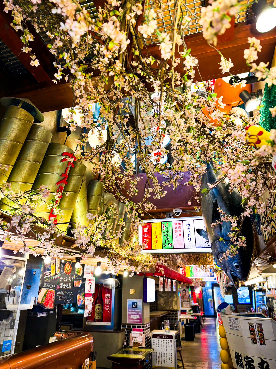 東京では、2026年の桜の開花予想は3/21頃、満開は3/28頃と言われておりますが、『ほぼ新宿のれん街 倉庫別館』では、3/6に一足先に桜が満開となりました。倉庫内の通路上部、テラスは見上げると一面の桜で彩られており、華やかで春らしい雰囲気の中でお食事をお楽しみ頂けます。特にテラス席は暖かな陽気も相まって、過ごしやすくなっておりますので昼飲みシーンにも是非ご利用ください。テラス席には屋根が付いているため、雨でもお花見をお楽しみ頂けます。
