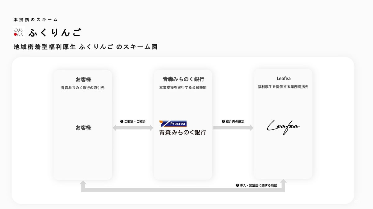 地域密着型福利厚生サービスを提供する株式会社Leafea(本社:東京都中央区、代表取締役:森田 渉、以下リーフィ)は、青森みちのく銀行(本店:青森県青森市、取締役頭取:石川 啓太郎)と提携を開始します。3/9(月)より青森みちのく銀行で地域密着型福利厚生サービス「ふくりんご」の取扱いを開始し、地域創生と日々頑張る方の支援を目指します。