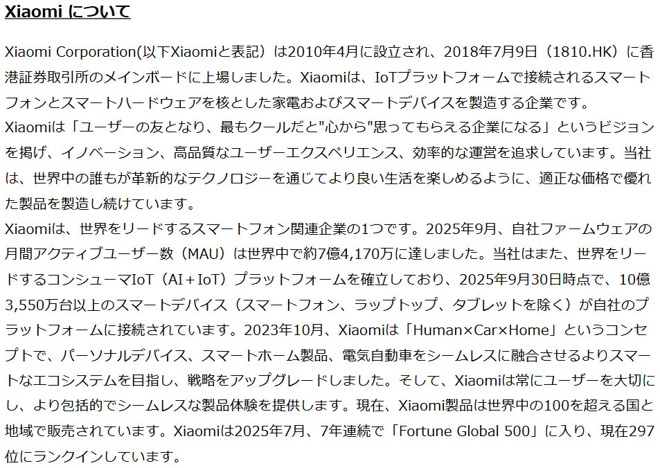 小米技術日本株式会社(以下シャオミ・ジャパンと表記)は、Xiaomiの日本現地法人として、2019年12月に日本市場に参入して以来、グローバルで展開する最先端のスマートフォンやIoT製品を数多く販売しています。