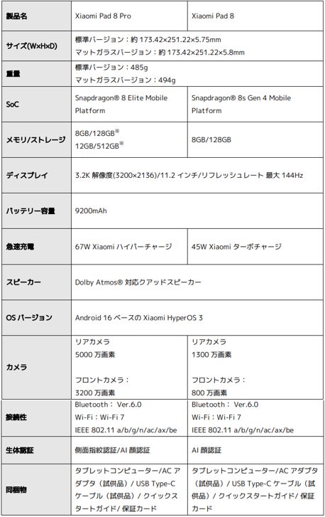 ※ Xiaomi Pad 8 Pro Matte Glass Versionのメモリ/ストレージは12GB/512GBのみとなります。Xiaomi Pad 8 Proのメモリ/ストレージは8GB/128GBのみとなります。