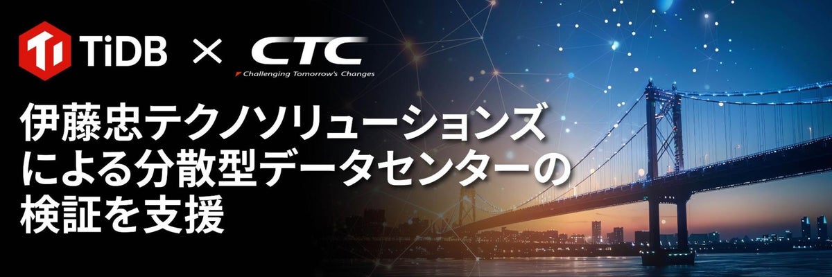 PingCAP株式会社 (本社:東京都千代田区、代表取締役社長:Eric Han、以下 PingCAP) は、伊藤忠テクノソリューションズ株式会社 (代表取締役社長:新宮 達史、本社:東京都港区、略称:CTC) が実施した、分散型データセンターの実現に向けた検証の支援を実施したことをお知らせします。本検証は、次世代通信基盤「オール光ネットワーク※1 (All Photonics Network、以下、APN)」と分散型データベース「TiDB (タイディービー)」を組み合わせ、電力消費を抑制しながら、データ処理能力を高める次世代インフラの構築を目指したものです。