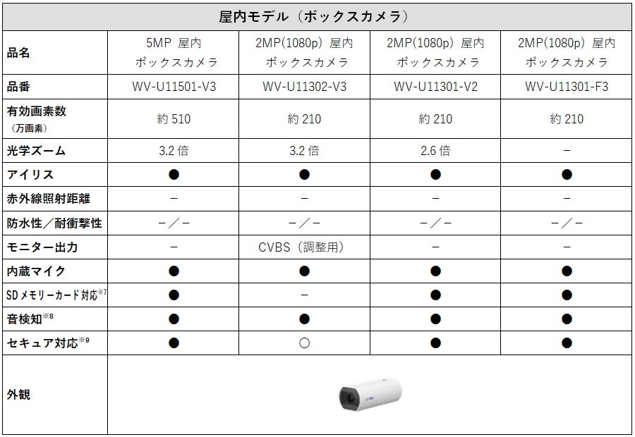 ※8:音検知機能の搭載/非搭載にかかわらず、動体検知(VMD)、妨害検知(SCD)は全機種搭載。