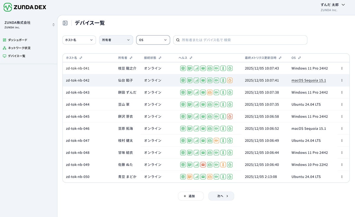 ZUNDA DEXは、軽量なエージェントをデバイスにインストールすることで、従業員PCとネットワークの状態を常時収集・分析するメトリクス収集プラットフォームです。昨年6月にプロトタイプを発表し、ベータテストを経てこの度「ZUNDA DEX」製品版を正式リリースいたしました。