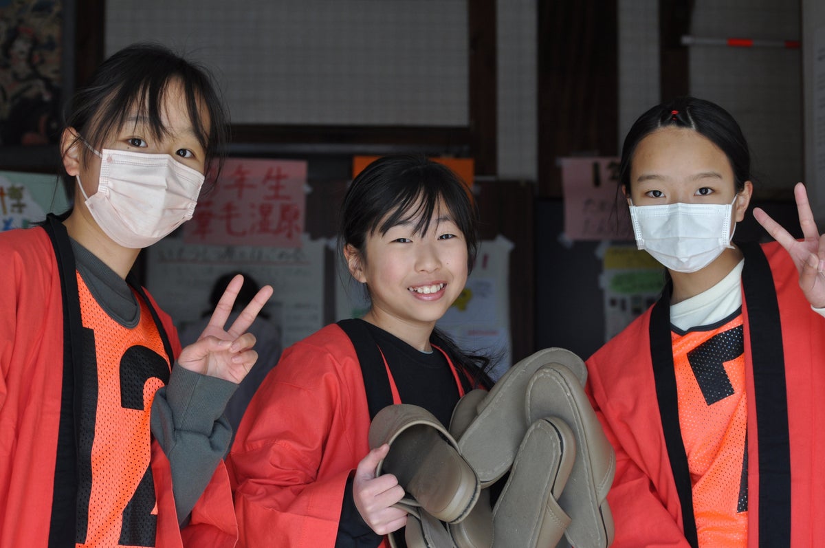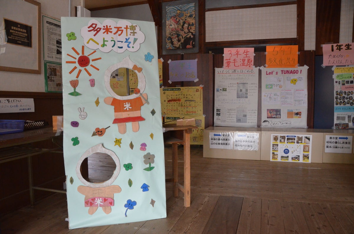 地元の人から「古多米(ふるため)」の愛称で親しまれるノスタルジックな木造旧校舎を万博会場に見立て、6年生が案内役となって、各パビリオンに訪れた下級生や保護者、地域の人を楽しませました。