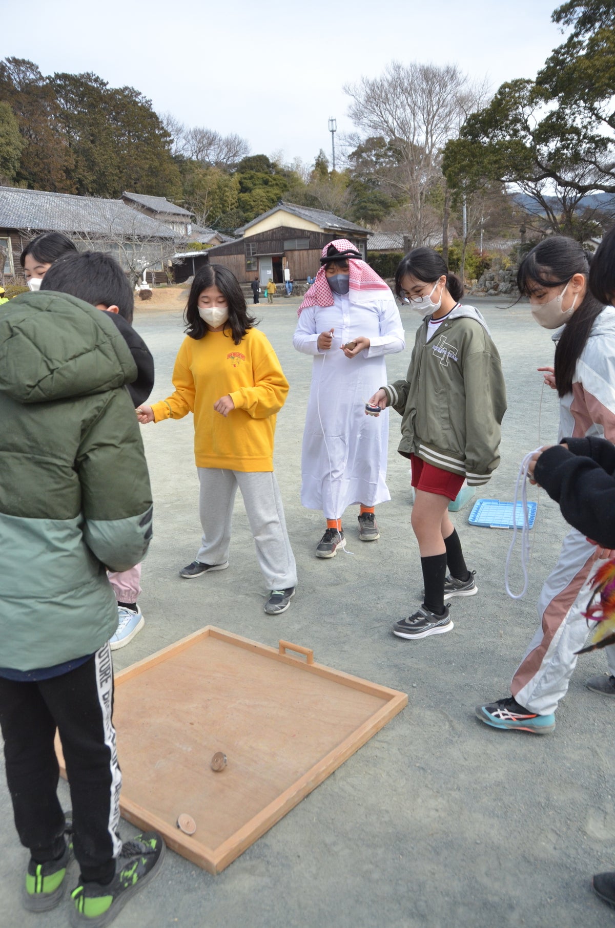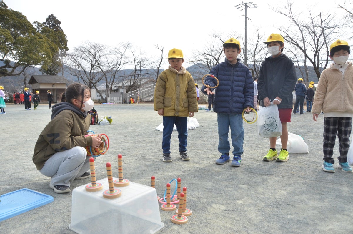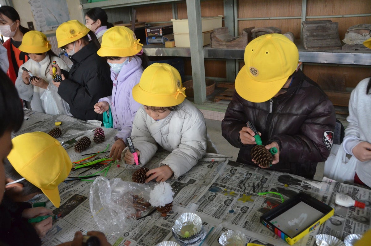 また、輪投げ、竹トンボなどの昔遊び体験や、松ぼっくりなどに色を塗ってキーホルダーにするものづくり体験のコーナーも用意され、下級生が飽きずに学べる工夫も随所に見られました。